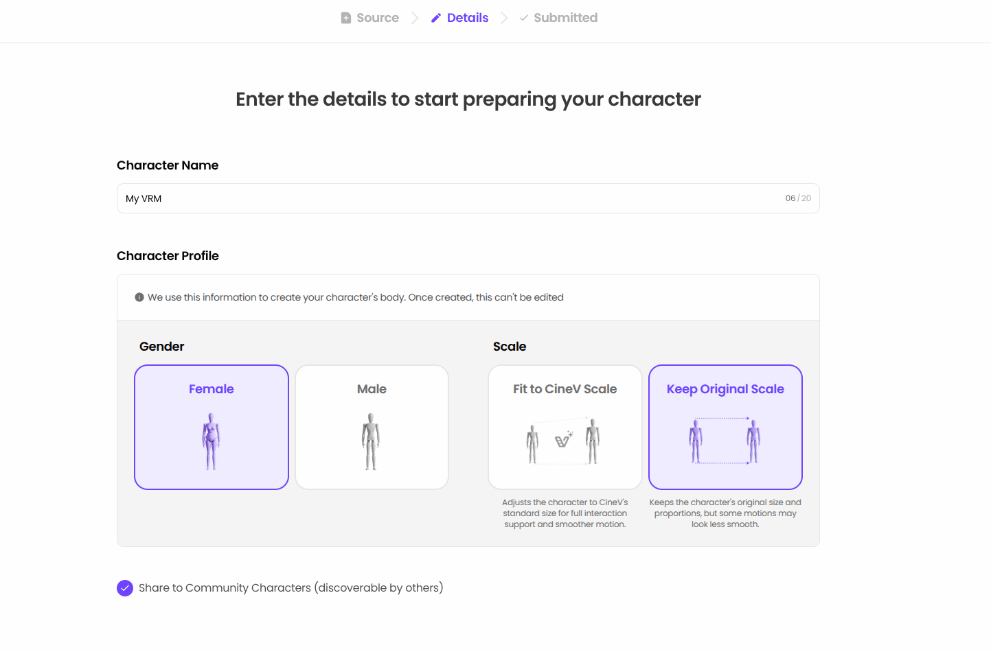 Using 'Fit to CineV Scale' may slightly alter the character’s proportions and can cause minor misalignment in some animations.